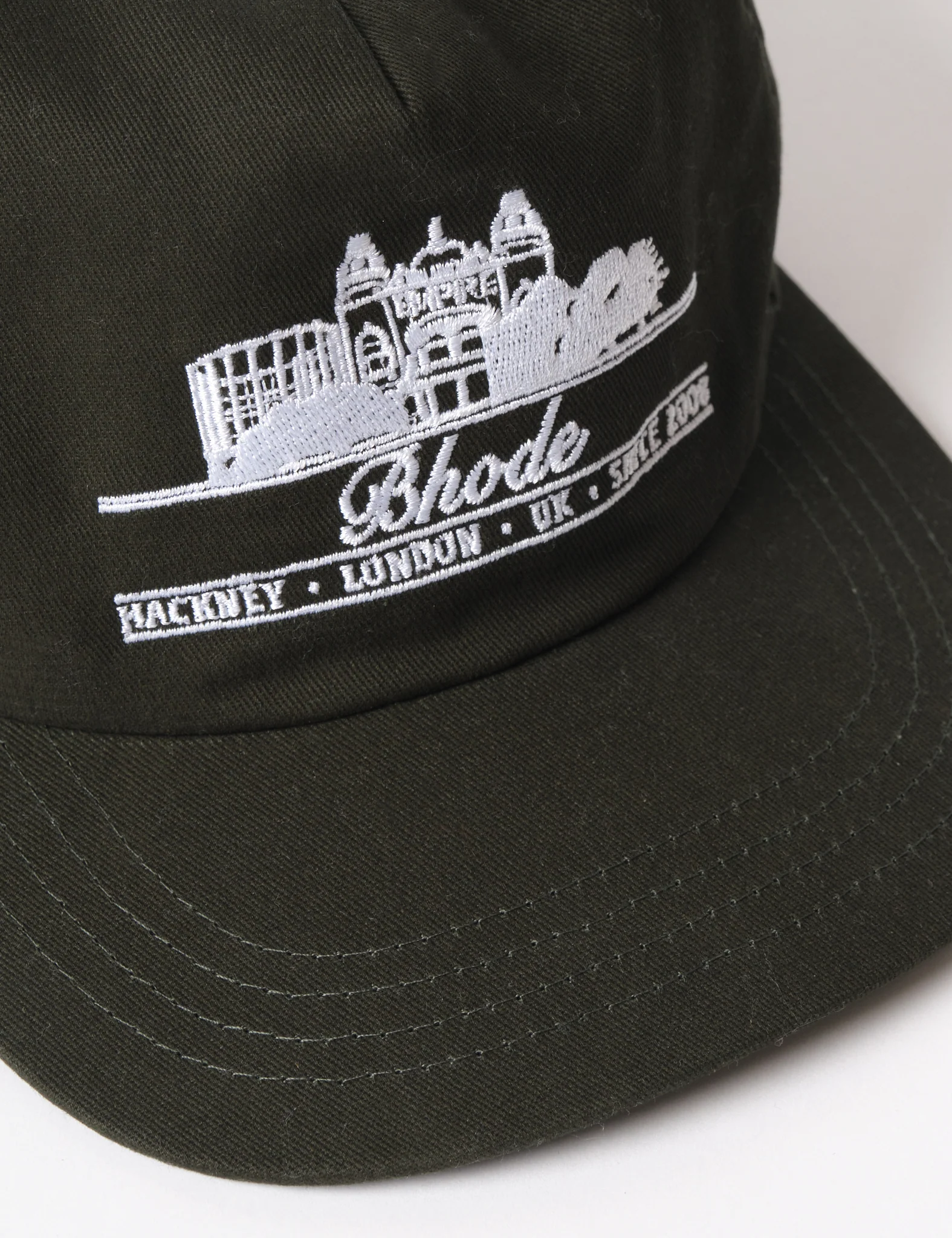 A new style which depicts Bhode brand heritage. Made in a 5 panel construction, with Hackney inspired embroidered graphic on the front panel, featuring the Hackney Empire, industrial gas towers, and trees from London's beloved parks.
