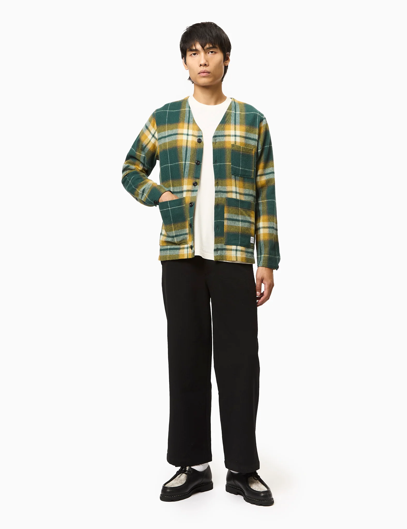 Crafted with an all over plaid detailing, this super comfortable piece features a classic low cardigan neck, six button front, and twin patch hand pockets.