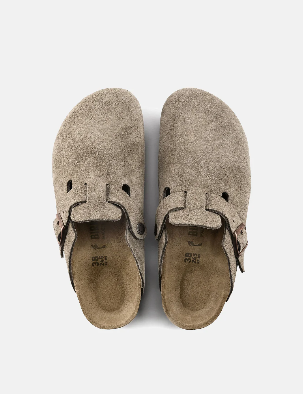 The Birkenstock Boston sandals in Taupe suede from the Birkenstock sandals classic collection.